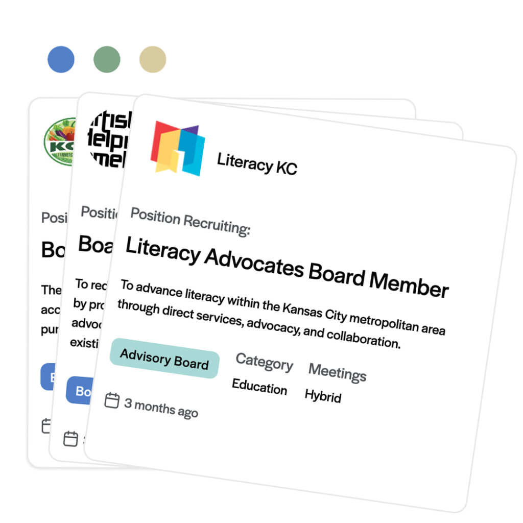 Linking Engaged Leaders with Purpose-Driven Boards Linking Engaged Leaders with Purpose-Driven Boards Meet Your Match View Opportunities ONBOARD FOR VOLUNTEERS Find a volunteer role with a local purpose-driven organization Browse & apply for committee memberships, board seats, event coordinator positions, and more. Create your free profile and meet your match. Learn More ONBOARD FOR ORGANIZATIONS Connect with our community of ready-to-serve volunteers Post your nonprofit’s volunteer roles and receive applications from ready-to-serve volunteers who are mission-aligned with your organization. Learn More Discover non-profits whose missions you care about. Subscribe to email notifications for new board seat openings. Submit an application and start the conversation. Browse a directory of open volunteer roles with KC's purpose-driven orgs. See a great opportunity? Put your best foot forward and apply. Receive opportunities directly to your email inbox. Get OnBoard OnBoard is live for volunteers & nonprofits View Open Roles OnBoard KC | A Support KC Project Mary Mooney Burns | mary@onboardkc.org